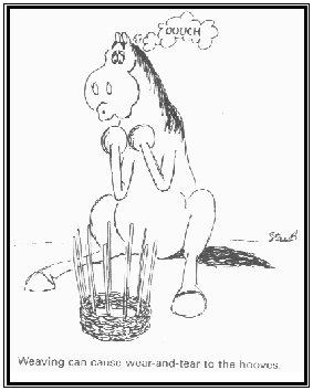 Stereotypic behaviours are safety valves that allow the horse to survive stress without life-threatening psychosis; attempts to curb the behaviour may be more harmful than the behaviour itself. If behaviours like box walking and weaving are prevented, the unacceptability of the environment is further enhanced and more pathological behaviour may result. The first step in prevention is designing an environment to accommodate the animal’s needs.